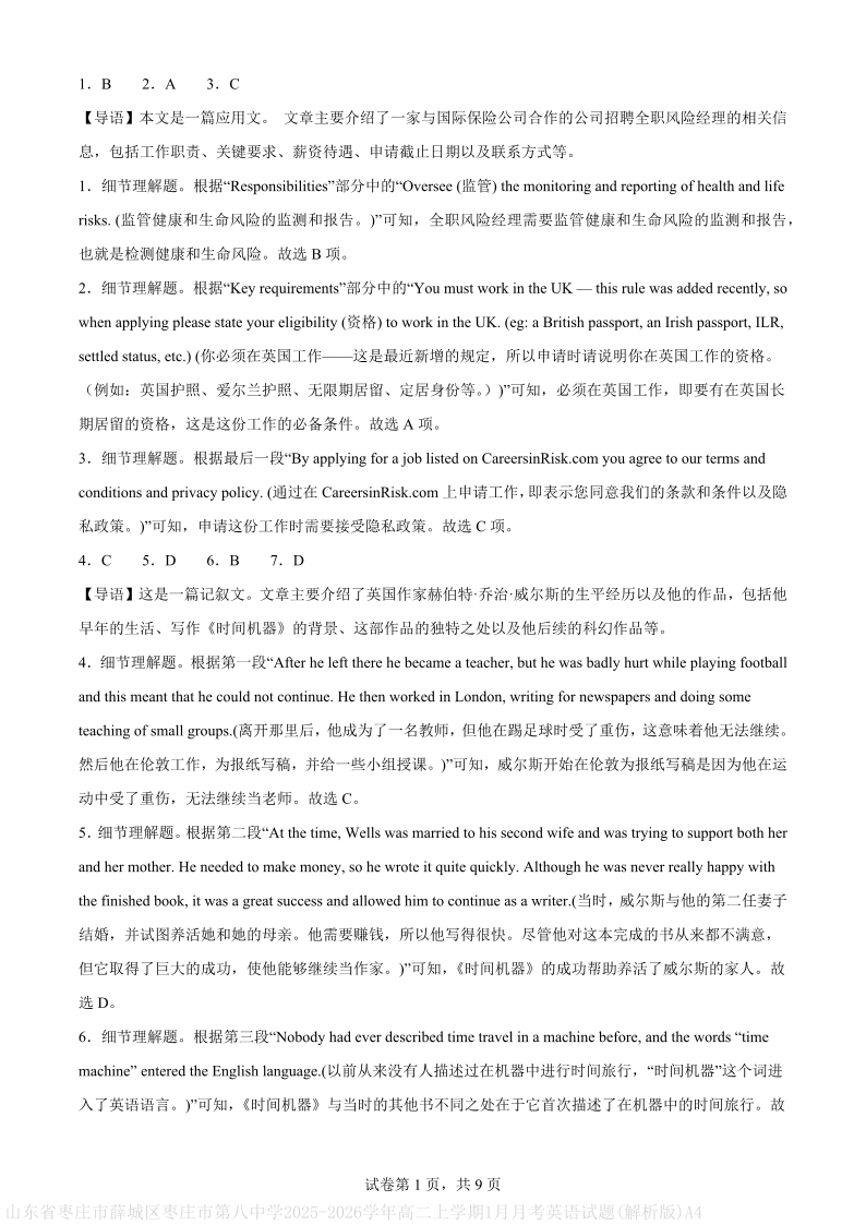 枣庄市第八中学2025-2026学年第一学期期末模拟定时训练 英语答案.pdf