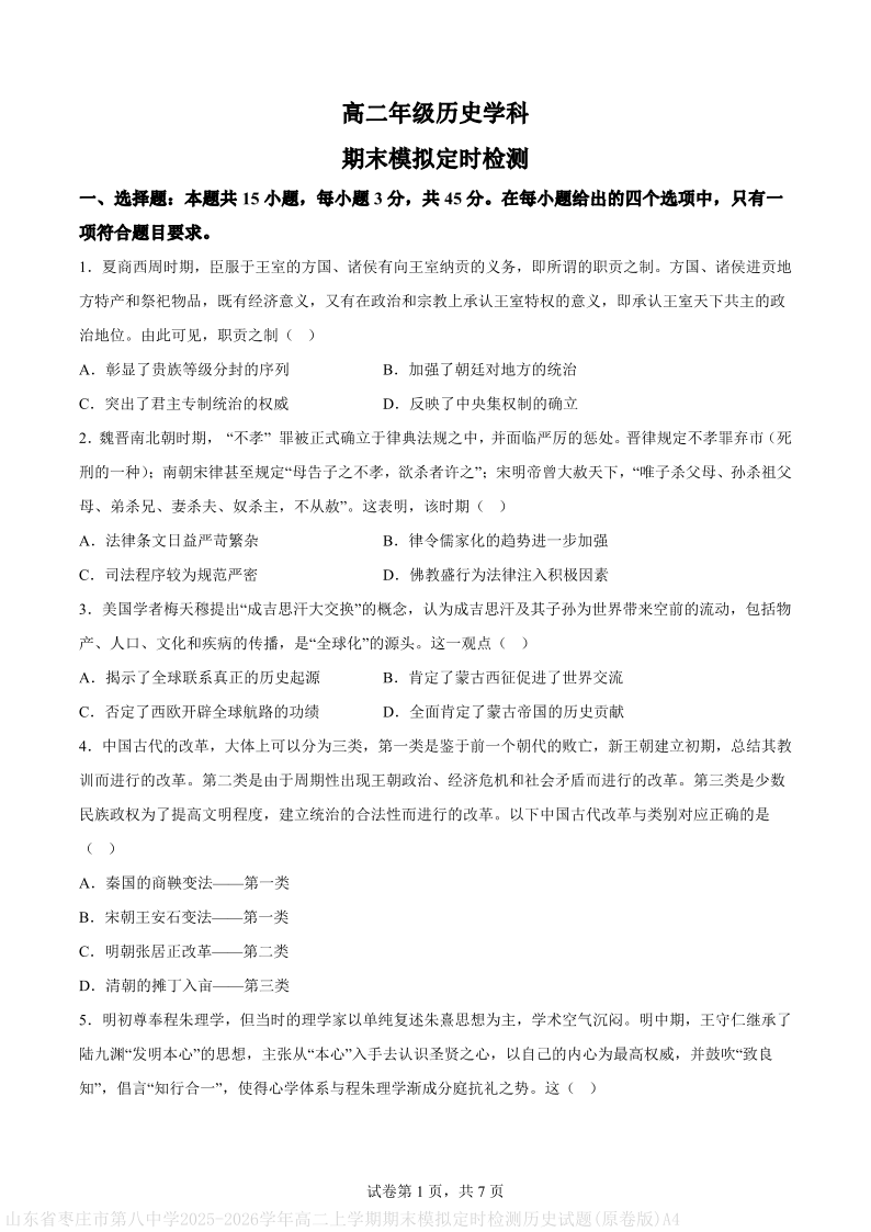 枣庄市第八中学2025-2026学年第一学期期末模拟定时训练 历史.pdf