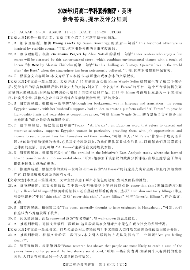 河池市2026年1月高二年级学科素养测评 英语答案.pdf