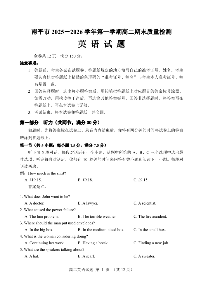 南平市2025~2026学年第一学期高二期末质量检测 英语试题(含答案).pdf