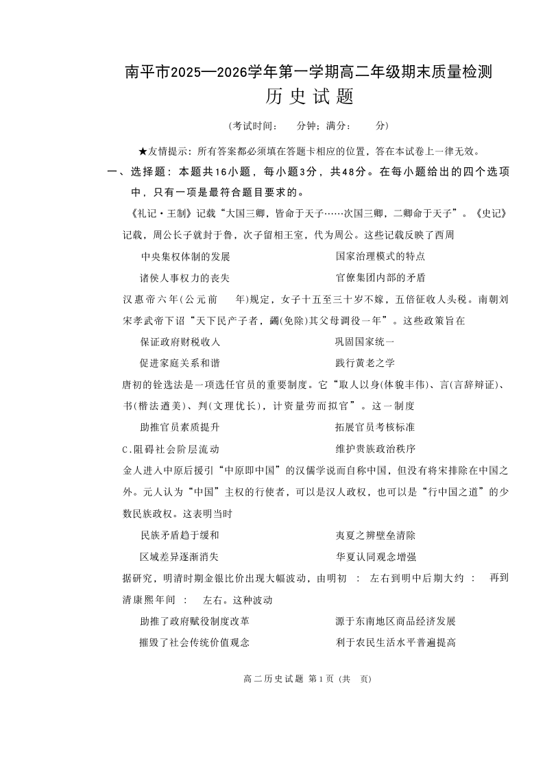 南平市2025~2026学年第一学期高二期末质量检测 历史试题(含答案).pdf