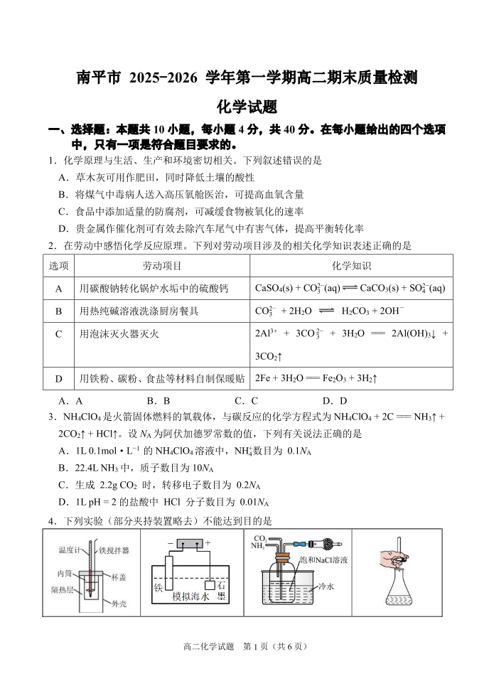 南平市2025~2026学年第一学期高二期末质量检测 化学试题(含答案).pdf