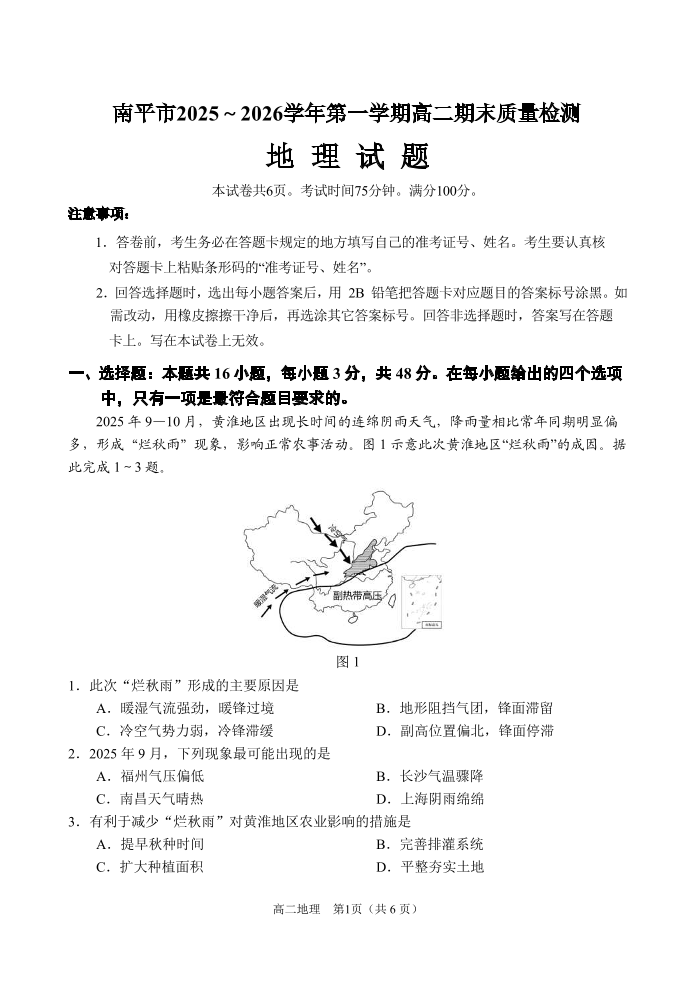 南平市2025~2026学年第一学期高二期末质量检测 地理试题(含答案).pdf