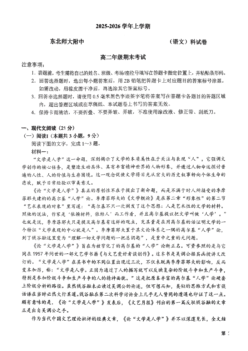 东北师大附中2025-2026学年上学期高二年级期末考试 语文试题(含答案).pdf