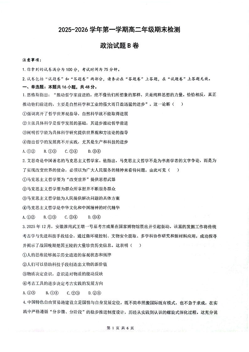 安徽省皖中名校联考2025-2026学年高二上学期2月期末 政治.pdf