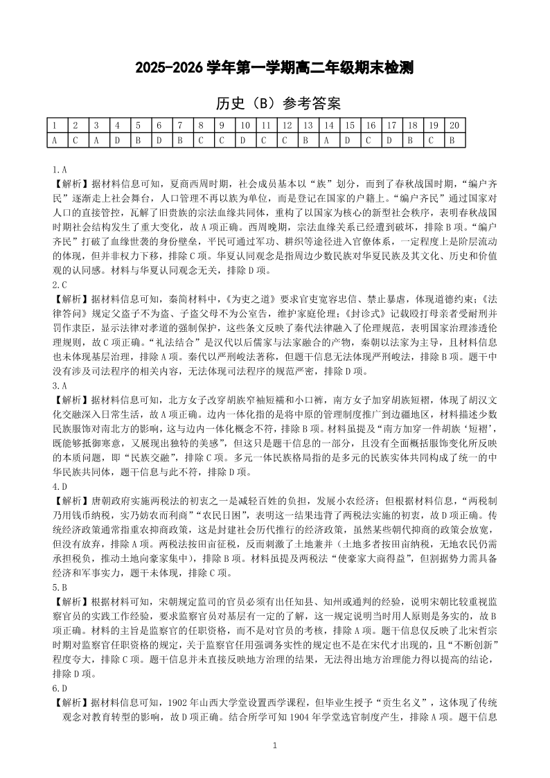 安徽省皖中名校联考2025-2026学年高二上学期2月期末 历史答案.pdf