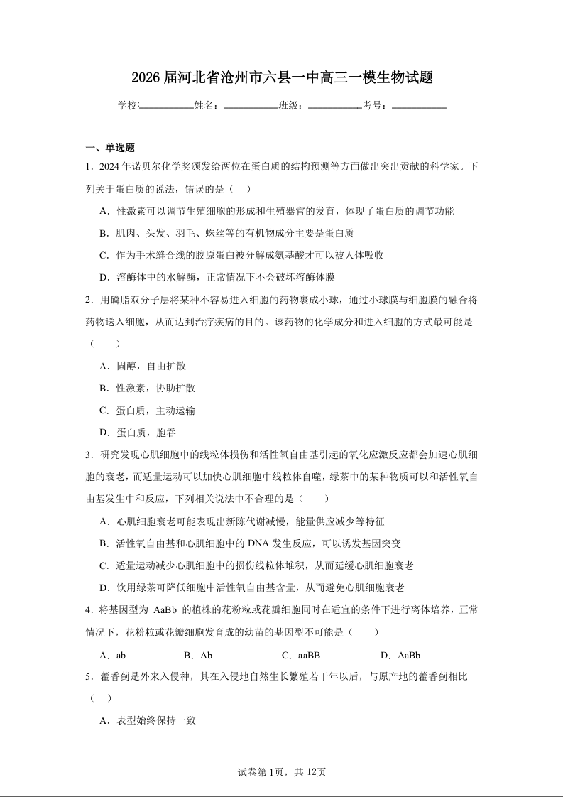 河北省沧州市2025-2026学年高三巩固训练 生物试题(含答案).docx