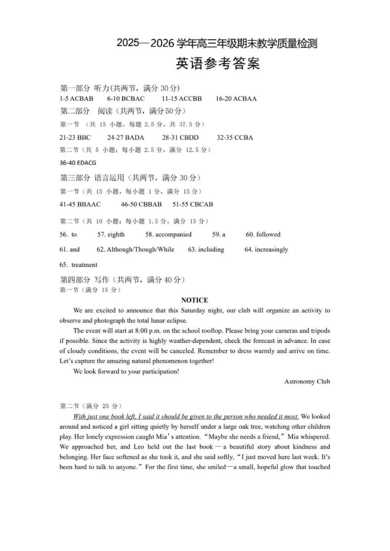 2025—2026学年度第一学期高三年级期末教学质量检测 英语答案.pdf