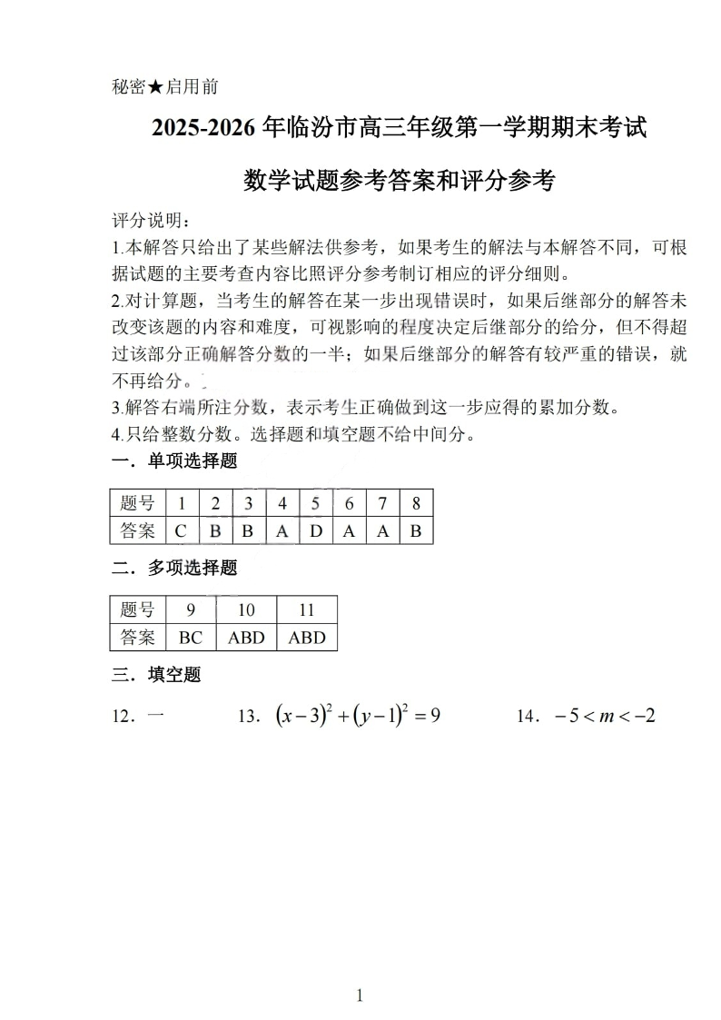 临汾市高三年级2025-2026学年度第一学期期末考试 数学答案.pdf