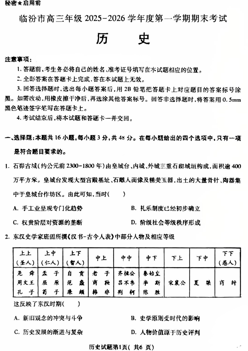 临汾市高三年级2025-2026学年度第一学期期末考试 历史.pdf