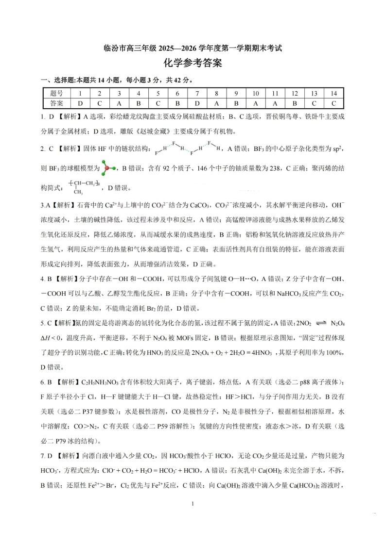 临汾市高三年级2025-2026学年度第一学期期末考试 化学答案.pdf