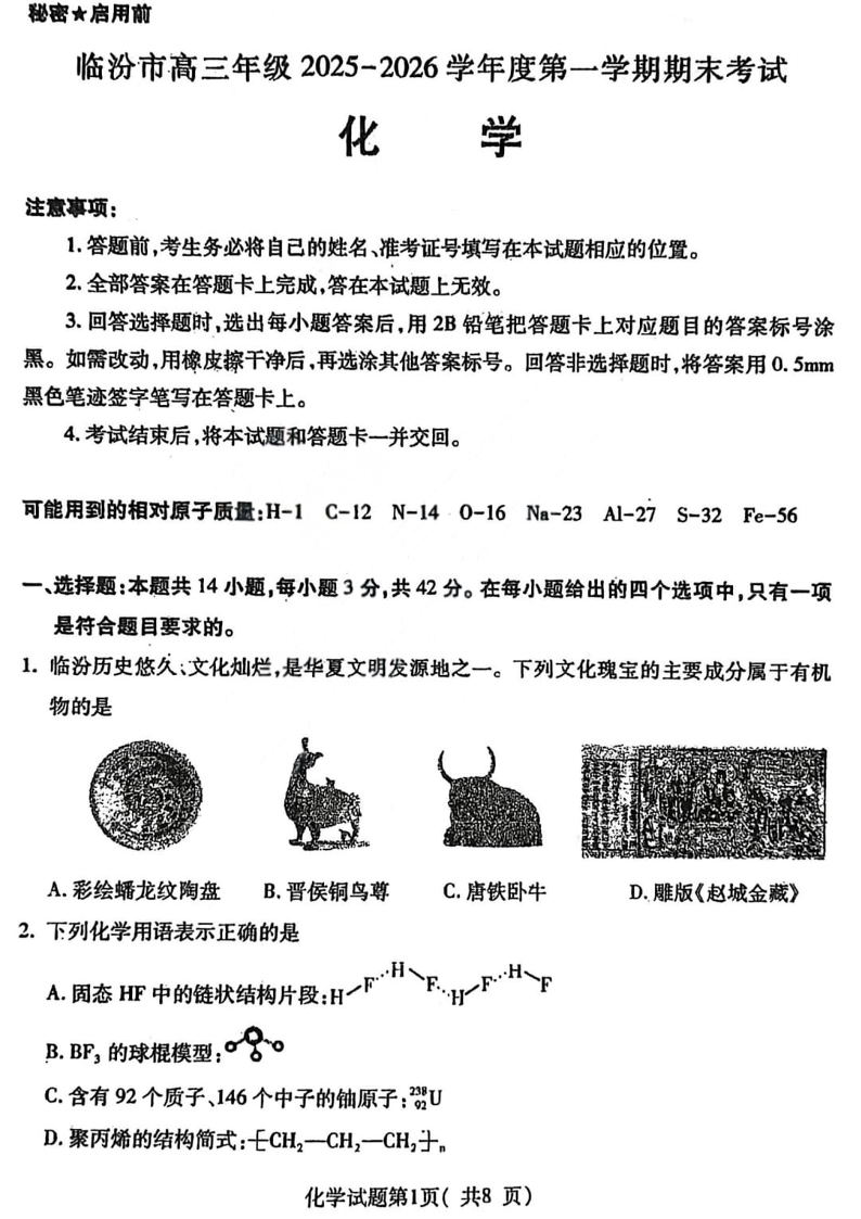 临汾市高三年级2025-2026学年度第一学期期末考试 化学.pdf