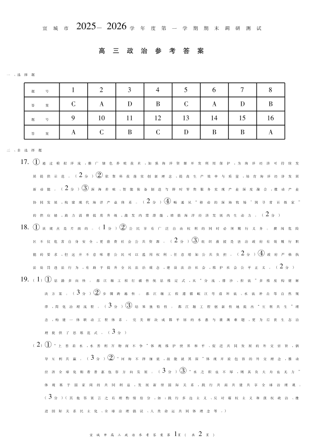 宣城市2025-2026学年度第一学期期末调研测试 政治答案.pdf