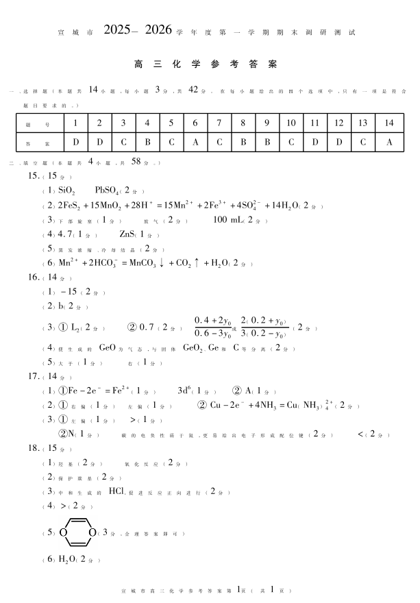 宣城市2025-2026学年度第一学期期末调研测试 化学答案.pdf