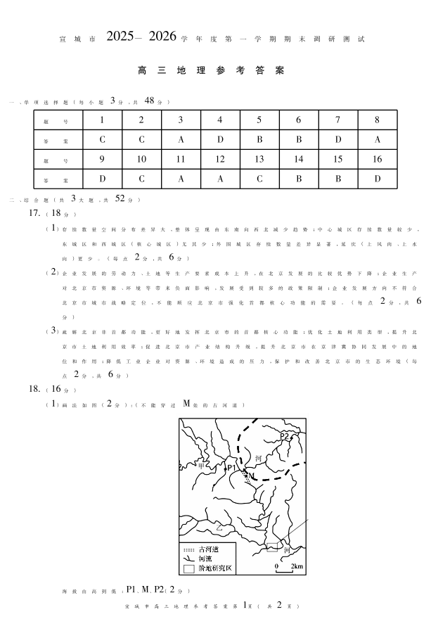 宣城市2025-2026学年度第一学期期末调研测试 地理答案.pdf