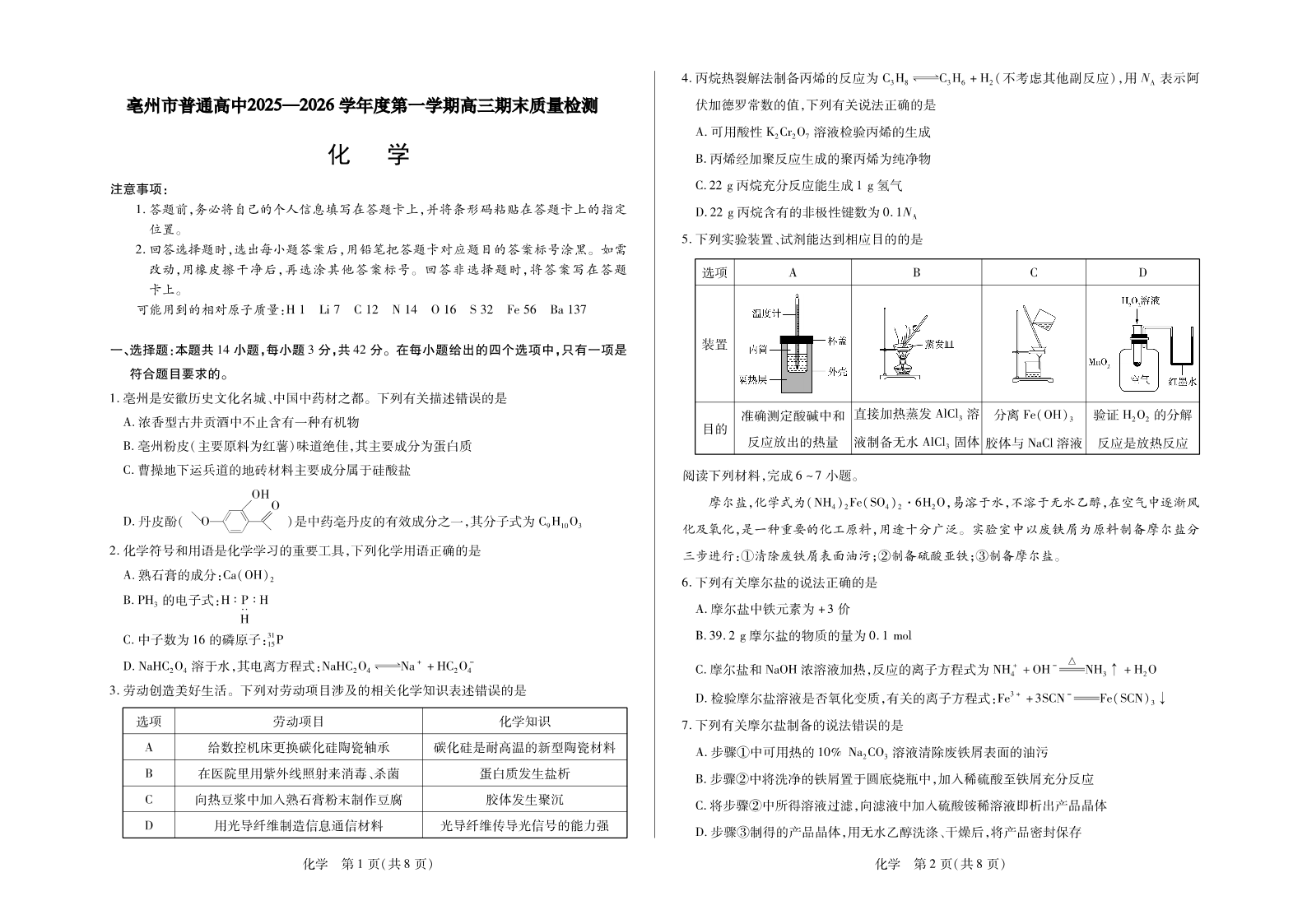 毫州市普通高中2025—2026学年度第一学期高三期末质量检测 化学.pdf