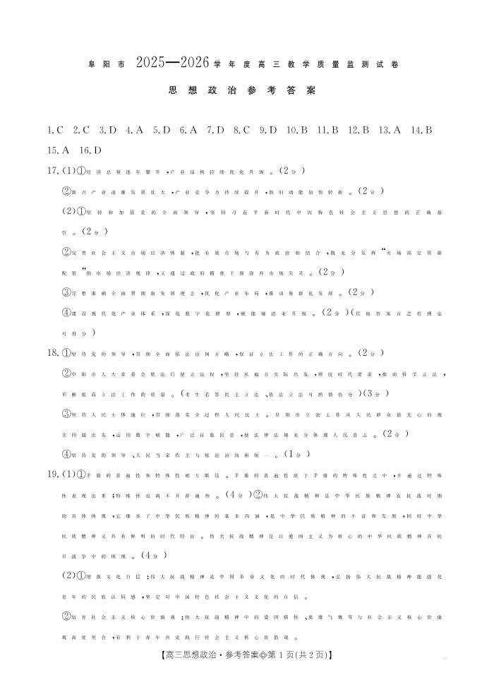 安徽省阜阳市2025一2026学年度高三教学质量监测 政治答案.pdf