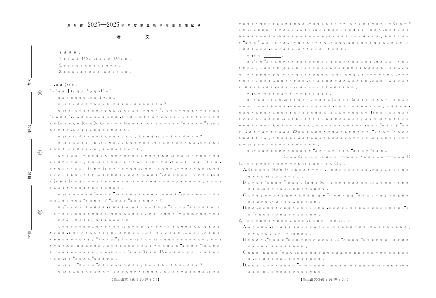 安徽省阜阳市2025一2026学年度高三教学质量监测 语文.pdf