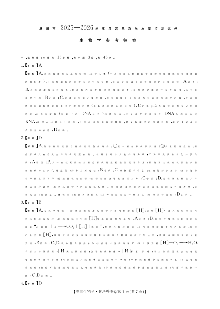 安徽省阜阳市2025一2026学年度高三教学质量监测 生物答案.pdf