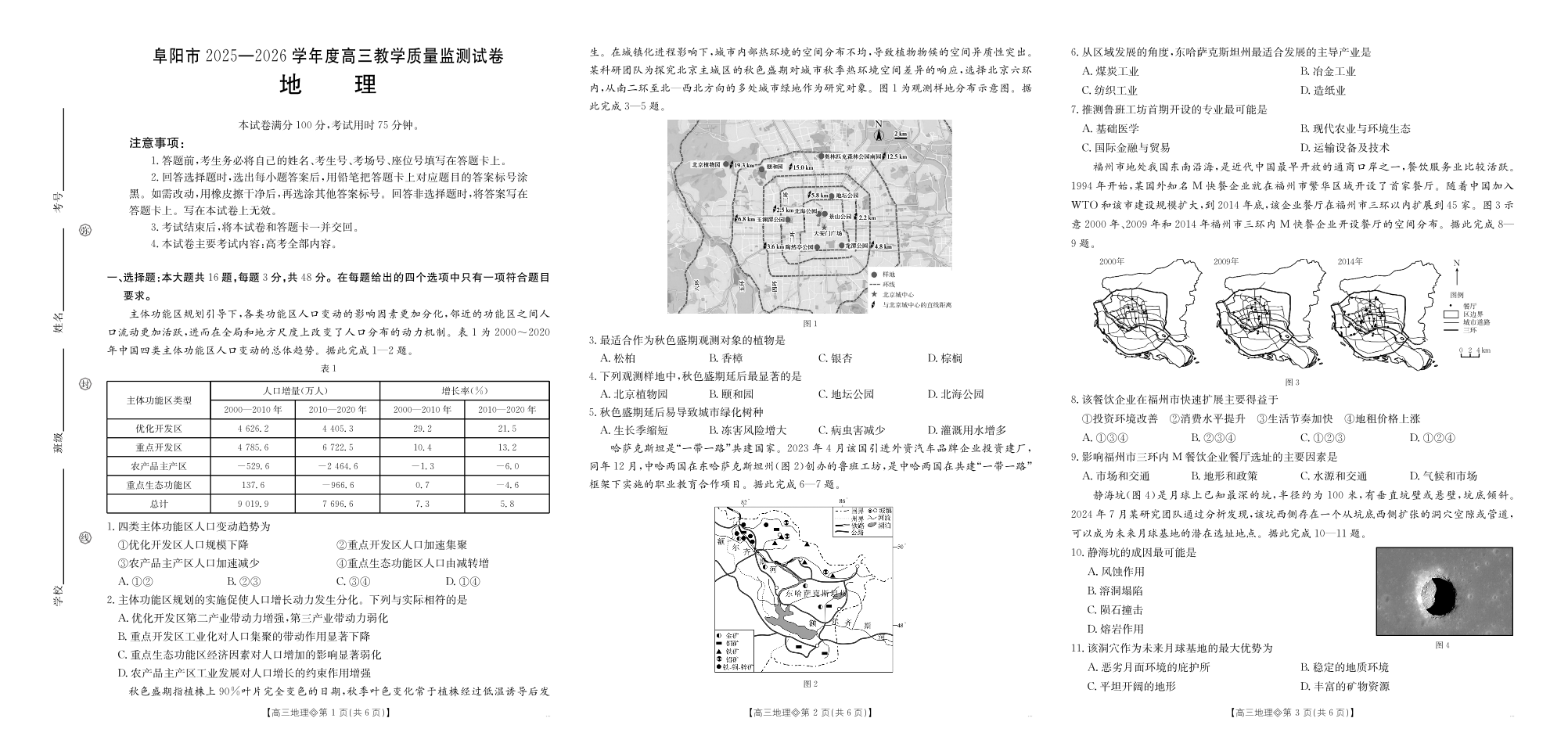 安徽省阜阳市2025一2026学年度高三教学质量监测 地理.pdf
