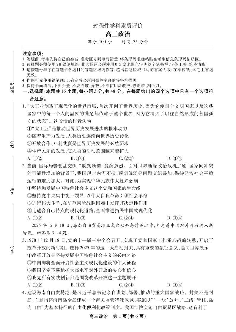 安徽省鼎尖联考2025-2026学年高三上学期期末过程性学科素质评价 政治.pdf