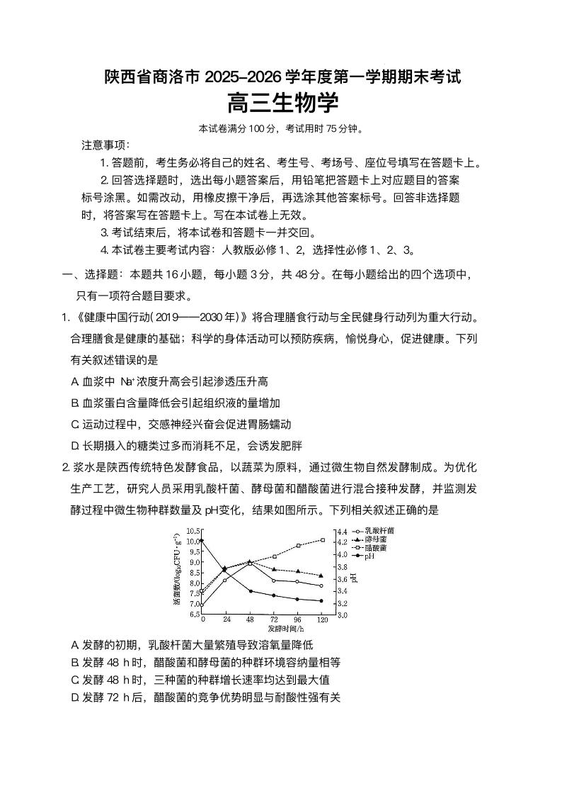 陕西省商洛市2026届高三上学期2月期末考试 生物试题(含答案).pdf