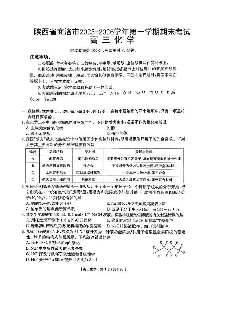 陕西省商洛市2026届高三上学期2月期末考试 化学试题(含答案).pdf