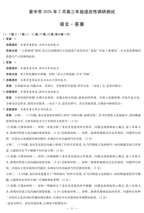 晋中市2026年2月高三年级适应性调研测试语文详细答案.pdf