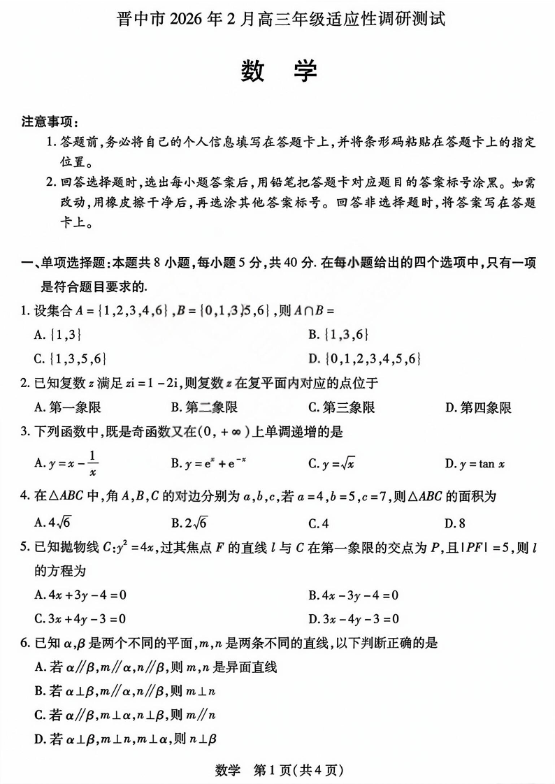 晋中市2026年2月高三年级适应性调研测试数学.pdf