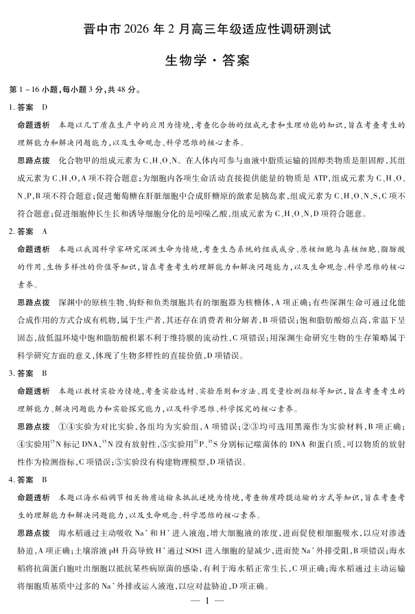 晋中市2026年2月高三年级适应性调研测试生物详细答案.pdf