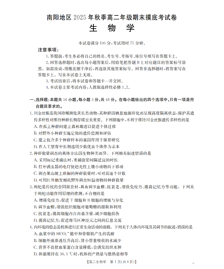 河南省南阳地区2025-2026学年高二上学期期末摸底考试 生物.pdf