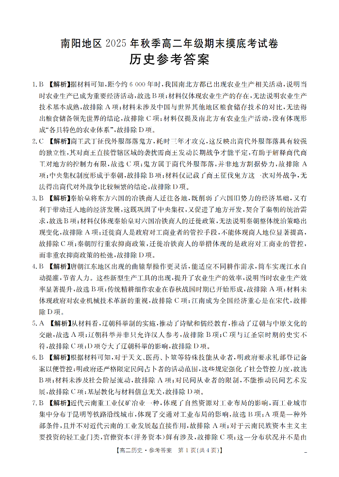 河南省南阳地区2025-2026学年高二上学期期末摸底考试 历史答案.pdf