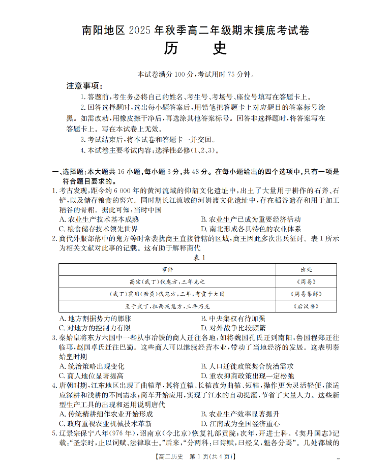 河南省南阳地区2025-2026学年高二上学期期末摸底考试 历史.pdf