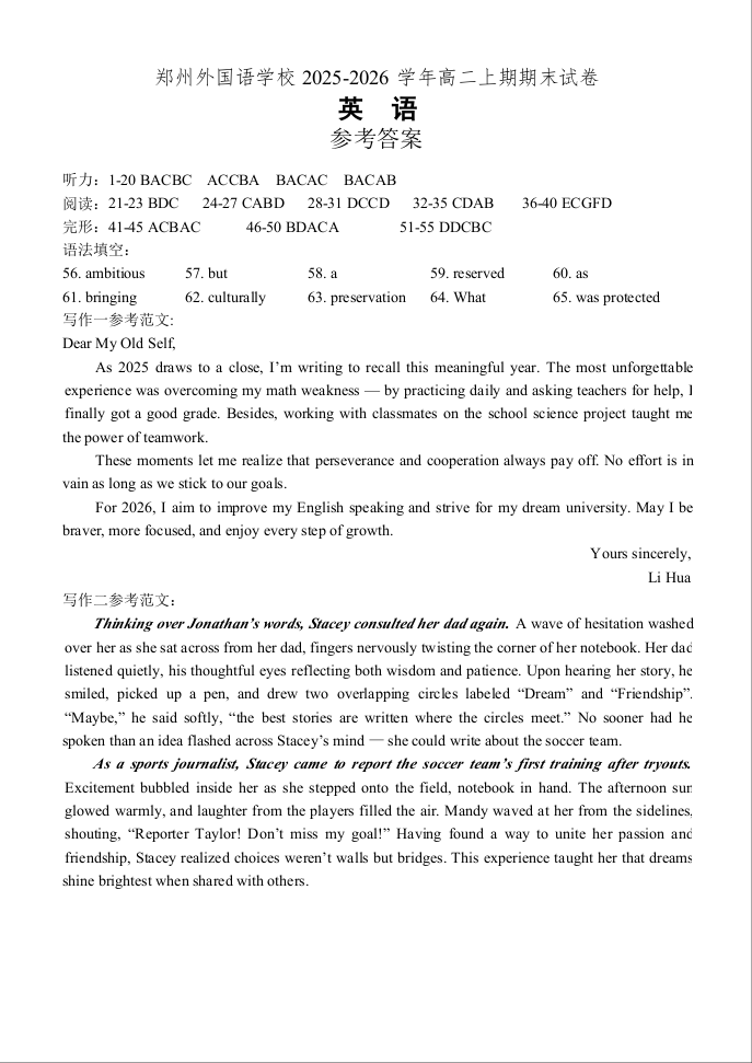 郑州外国语学校2025-2026学年高二上学期期末试卷 英语答案.docx
