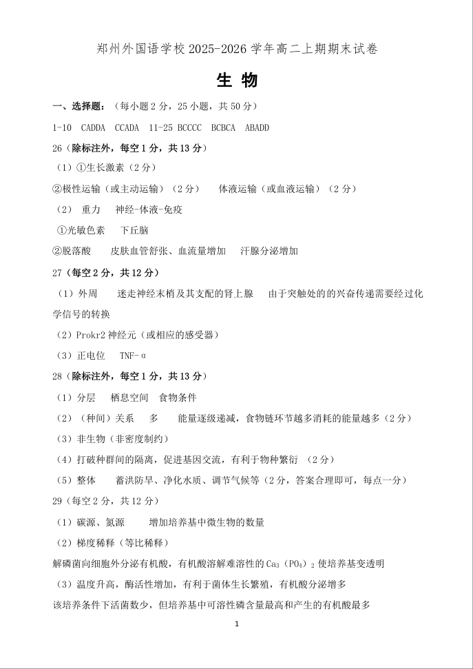 郑州外国语学校2025-2026学年高二上学期期末试卷 生物答案.docx