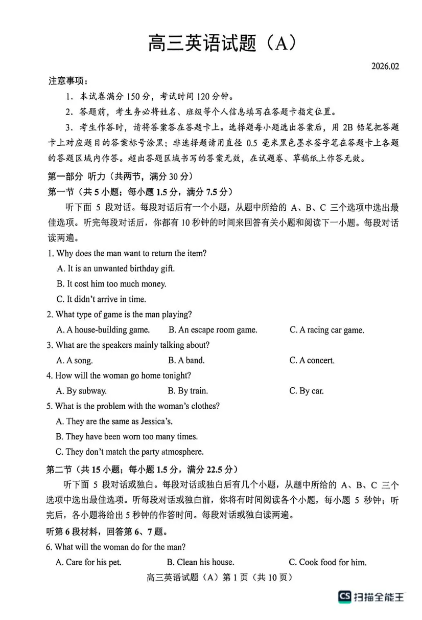 菏泽市2025-2026学年高三上学期期末 英语(A).pdf