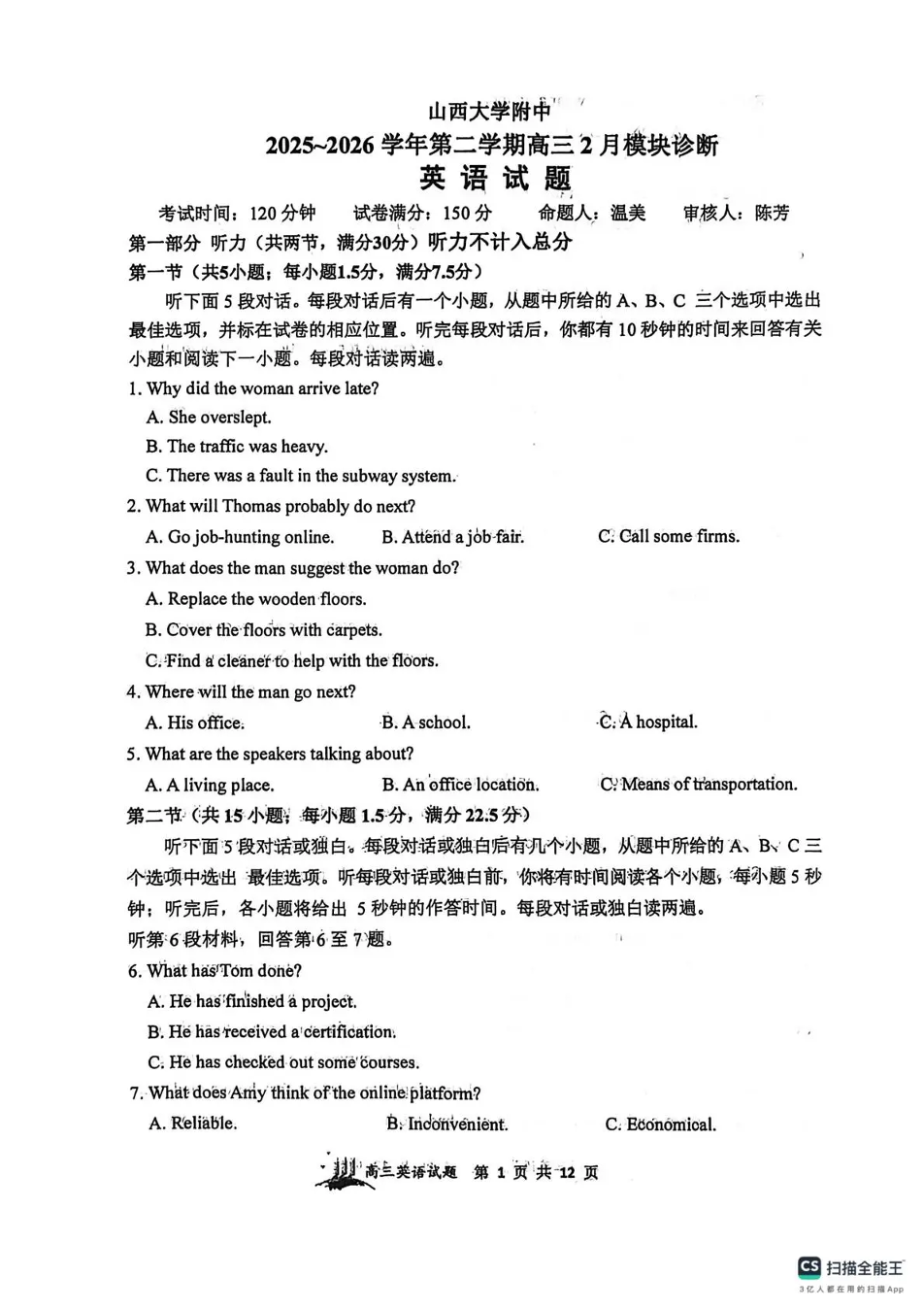 山西大学附中2025-2026学年高三年级第二学期2月模块诊断 英语.pdf