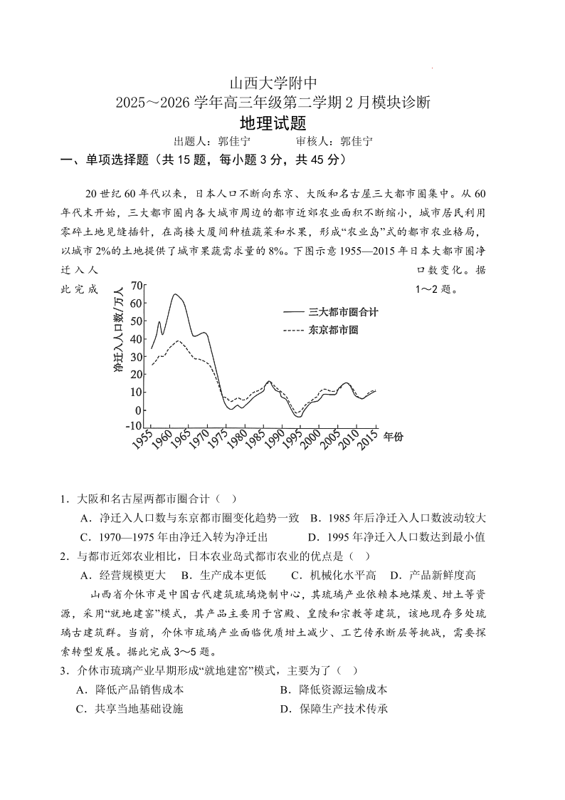 山西大学附中2025-2026学年高三年级第二学期2月模块诊断 地理.pdf