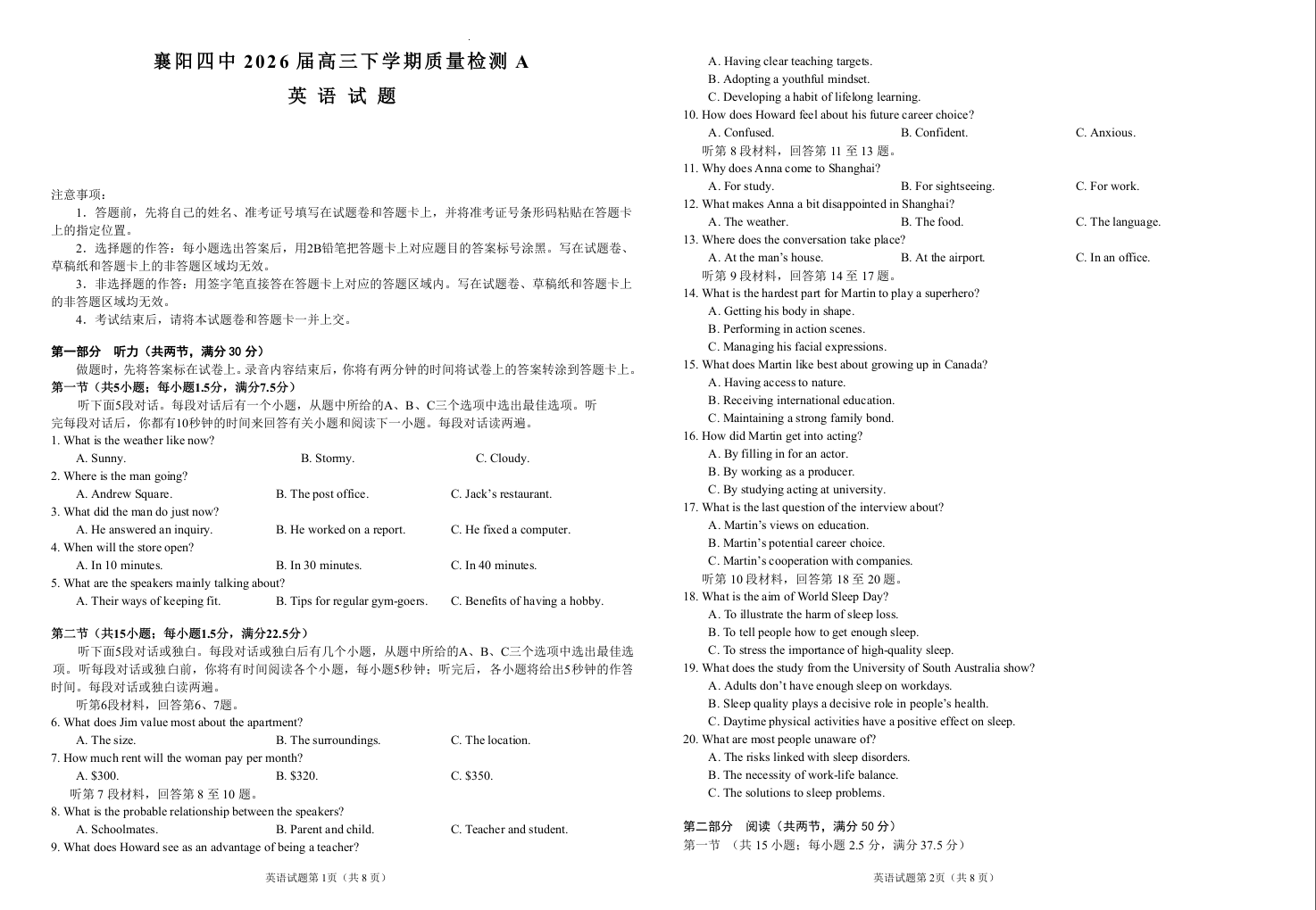 襄阳四中2026届高三下学期质量检测 英语试题(含答案).docx