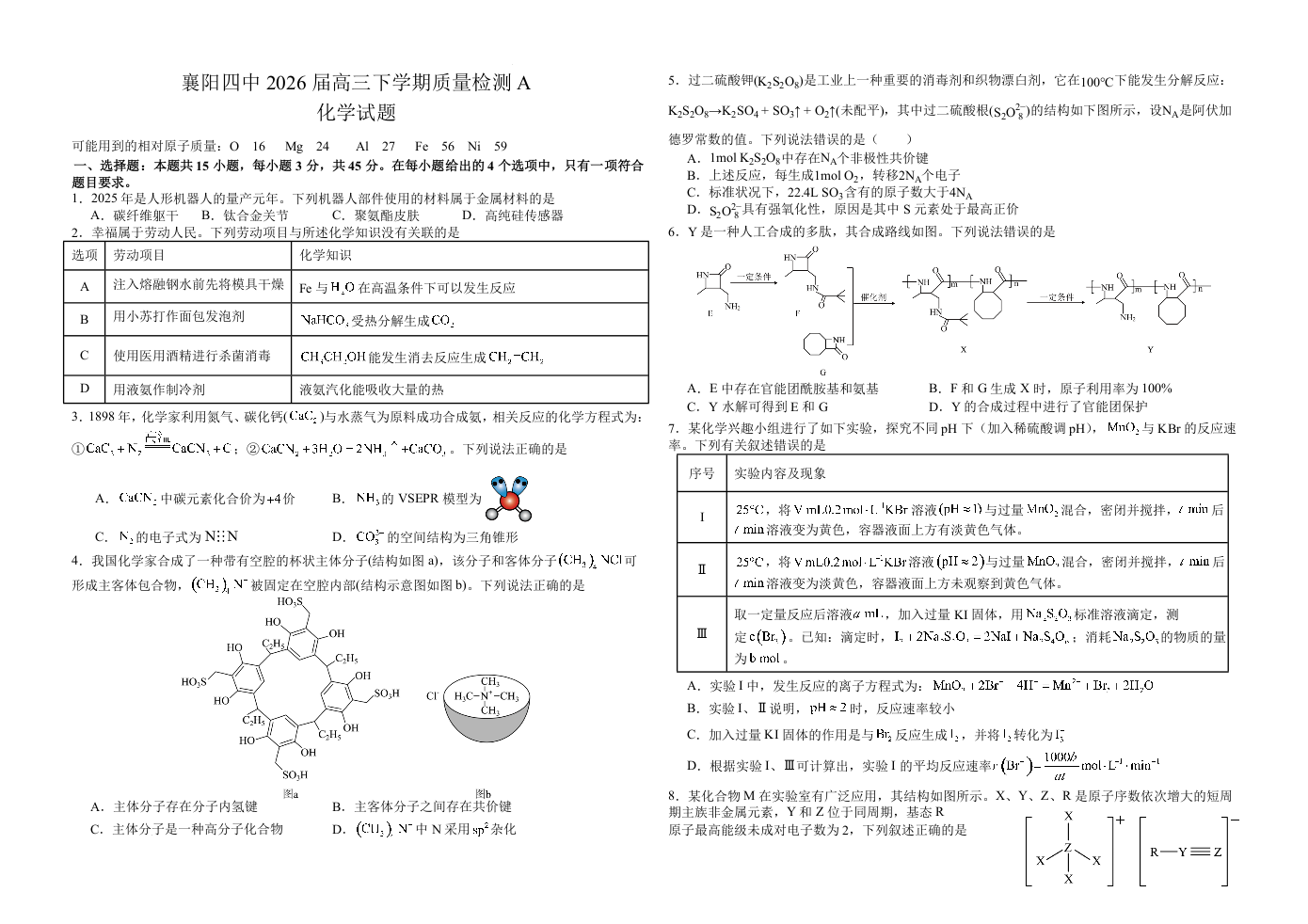 襄阳四中2026届高三下学期质量检测 化学试题(含答案).docx