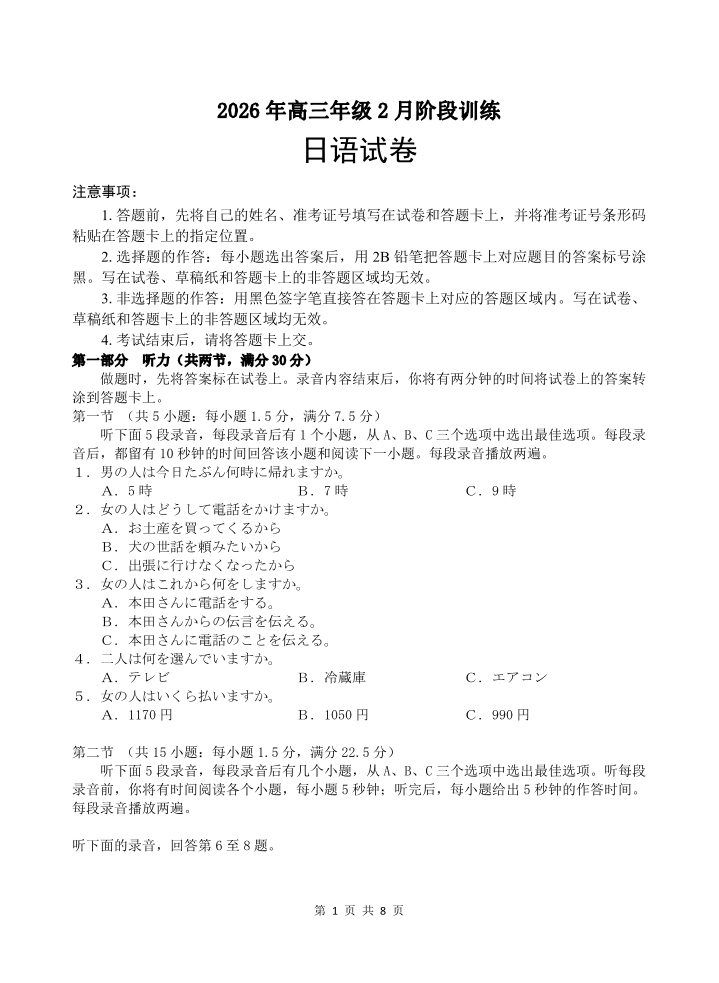 湖北省云学联盟2026年高三年级2月阶段训练 日语.pdf