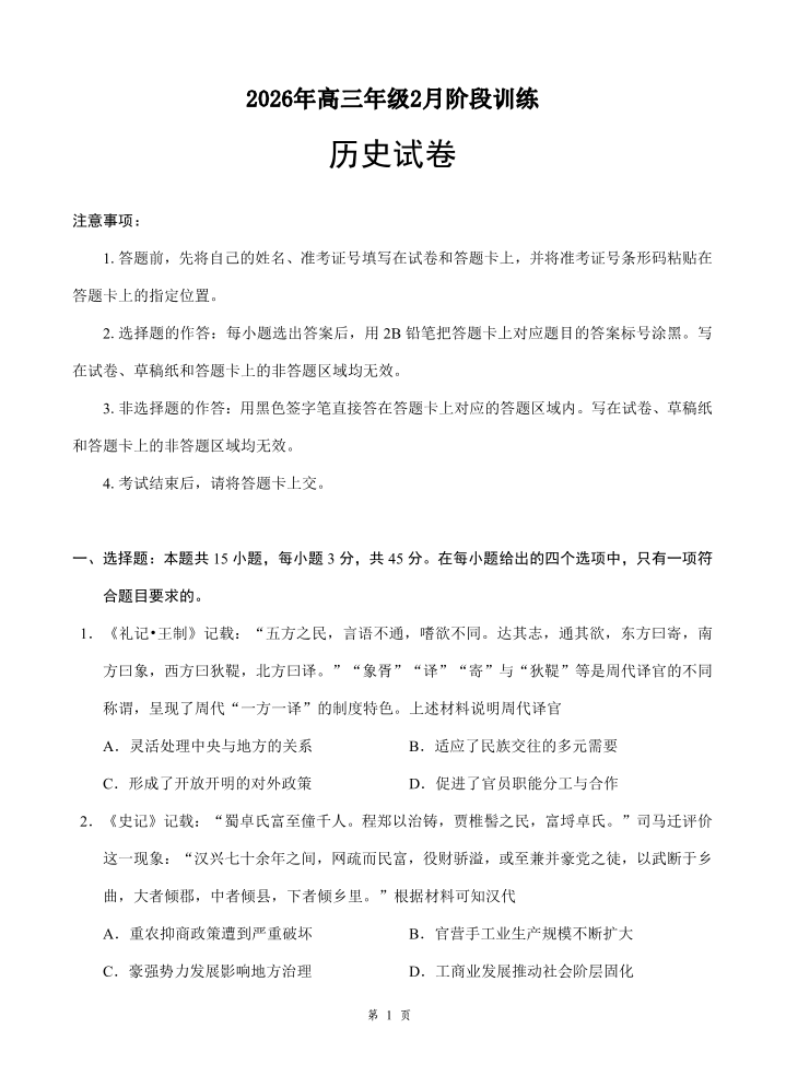 湖北省云学联盟2026年高三年级2月阶段训练 历史.pdf
