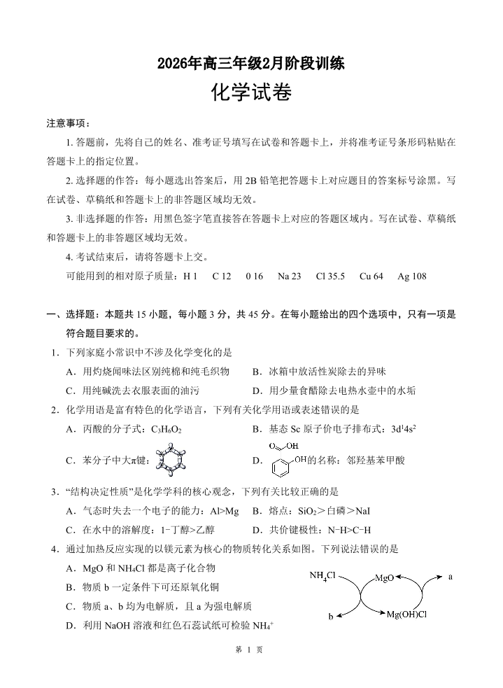 湖北省云学联盟2026年高三年级2月阶段训练 化学.pdf