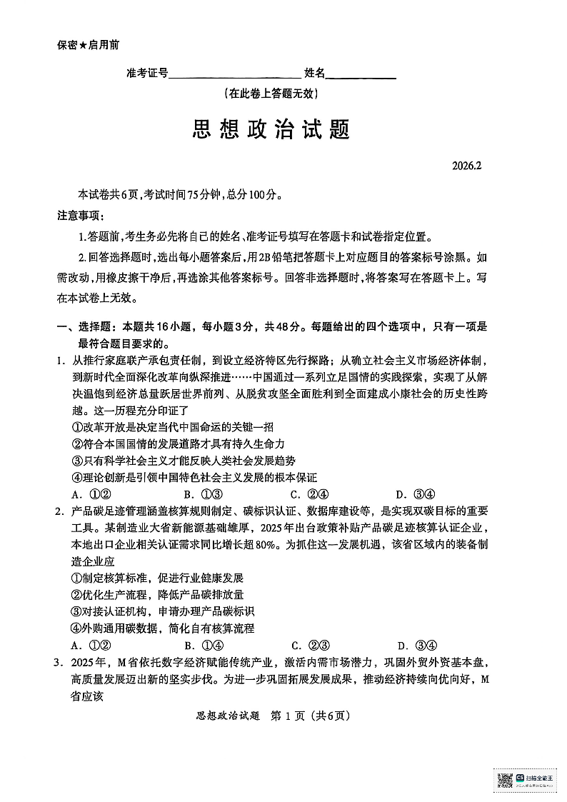 福建省名校联盟2026届高三下学期开学考试 政治.pdf