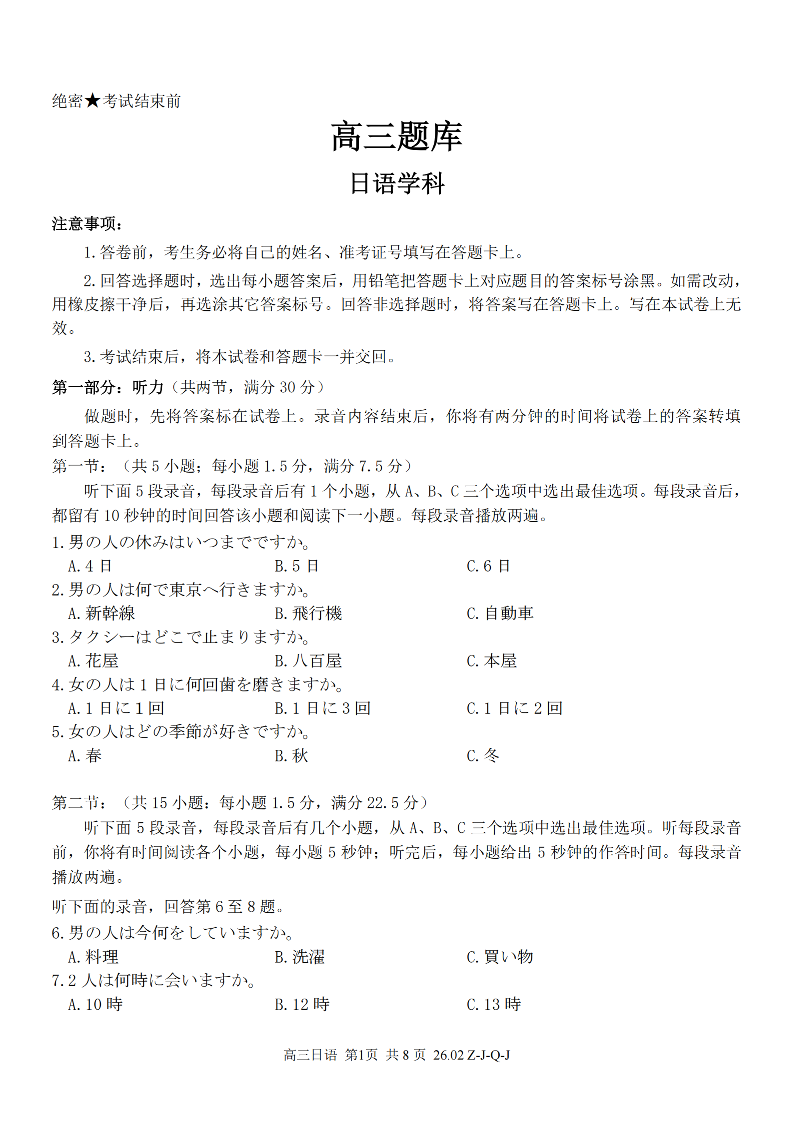 浙江省(浙南名校、七彩阳光、精诚联盟、金兰教育)2026年2月题库 日语.pdf