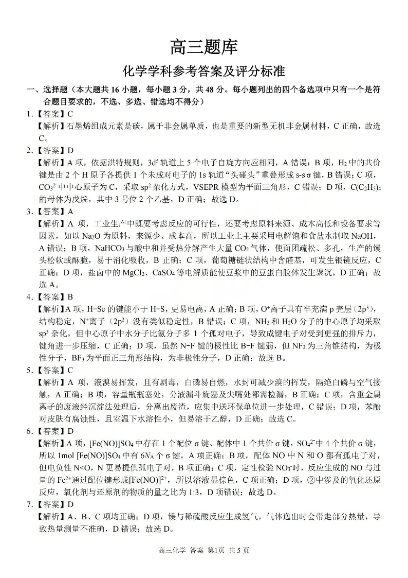 浙江省(浙南名校、七彩阳光、精诚联盟、金兰教育)2026年2月题库 化学答案.pdf