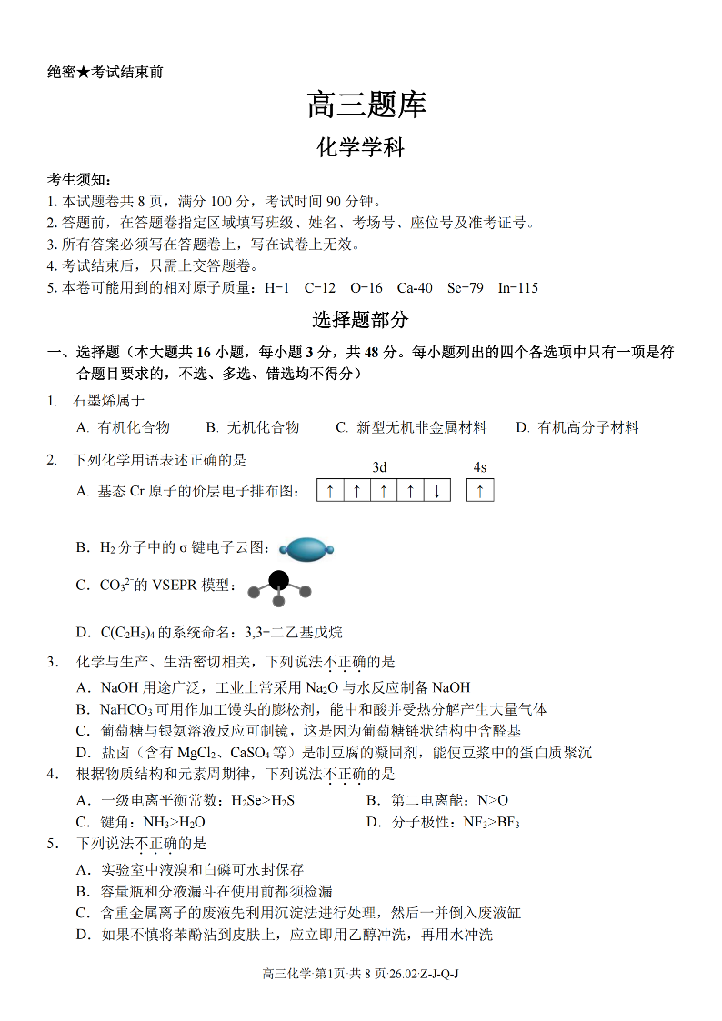 浙江省(浙南名校、七彩阳光、精诚联盟、金兰教育)2026年2月题库 化学.pdf