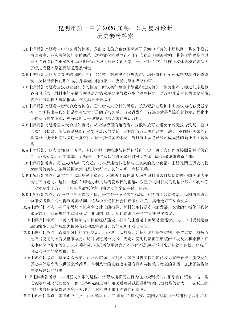昆明市第一中学2026届高三2月复习诊断 历史答案.pdf