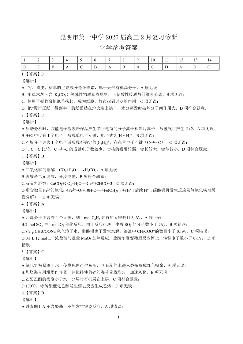 昆明市第一中学2026届高三2月复习诊断 化学答案.pdf