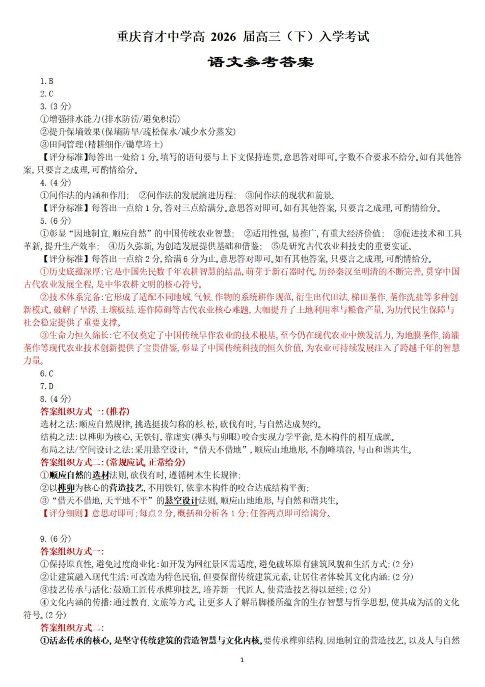 重庆育才中学高2026届高三(下)入学考试 语文答案.pdf
